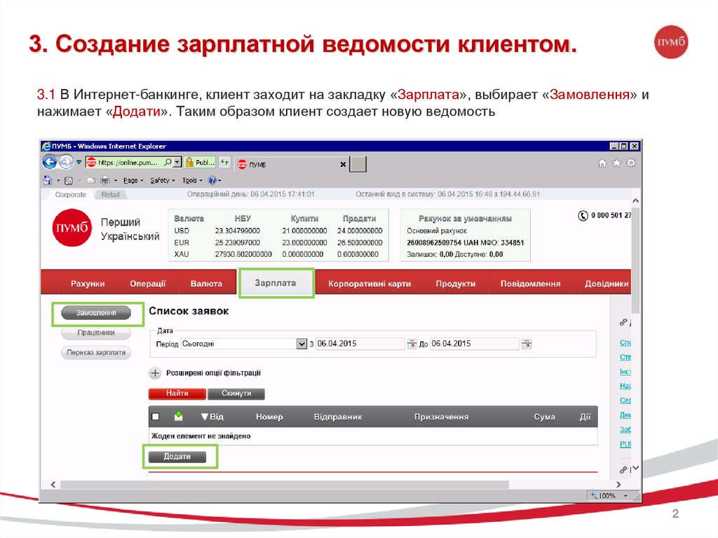 3. Создание зарплатной ведомости клиентом.3.1 В Интернет-банкинге, клиент заходит на закладку «Зарплата», выбирает «Замовлення» и