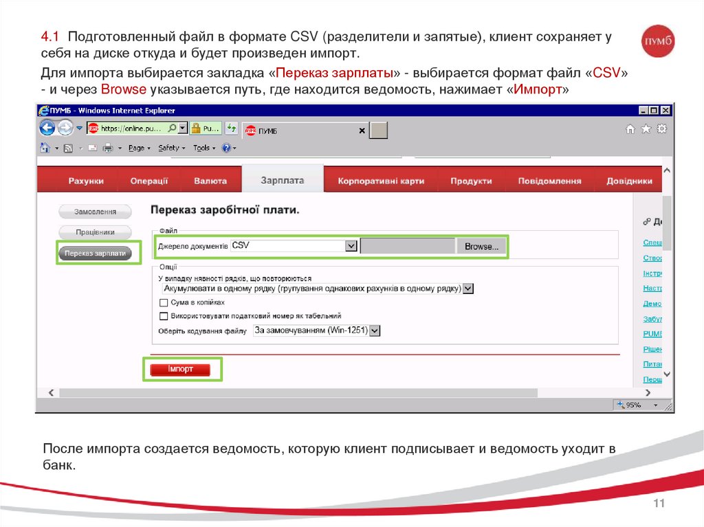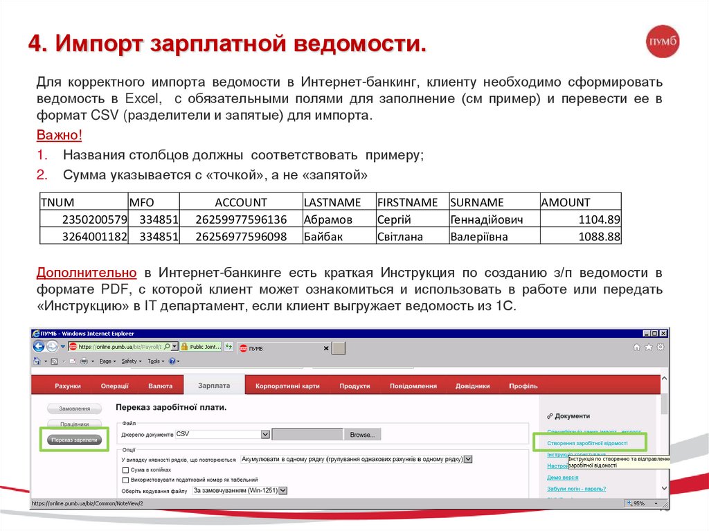 4. Импорт зарплатной ведомости.Для корректного импорта ведомости в Интернет-банкинг, клиенту необходимо сформировать