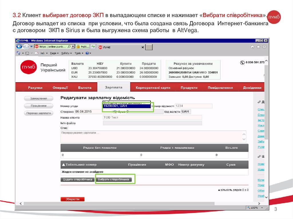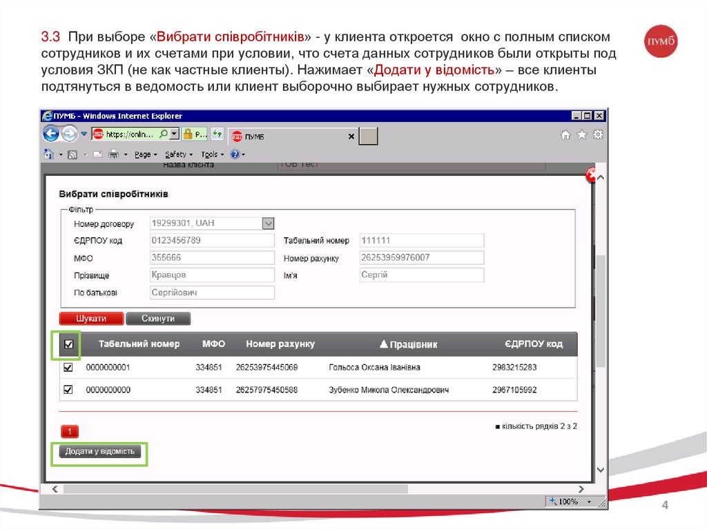 3.3 При выборе «Вибрати співробітників» - у клиента откроется окно с полным спискомсотрудников и их счетами при условии, что счета данных сотрудников были открыты под