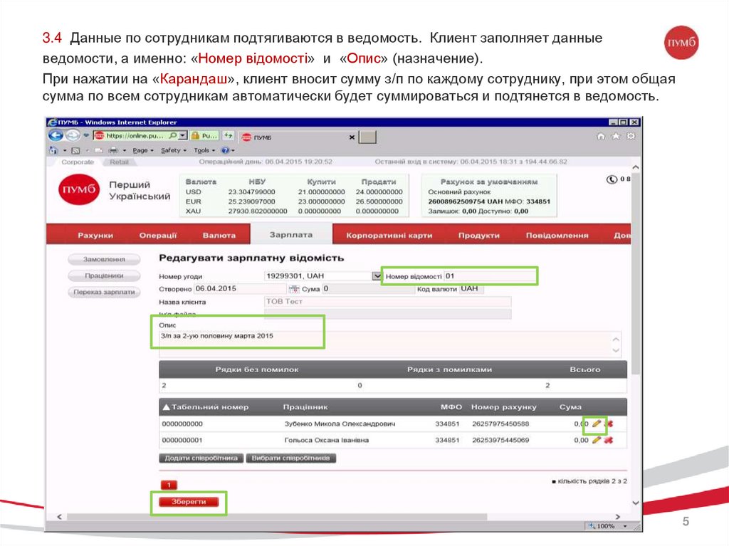 3.4 Данные по сотрудникам подтягиваются в ведомость. Клиент заполняет данныеведомости, а именно: «Номер відомості» и «Опис» (назначение).