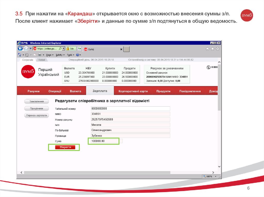 3.5 При нажатии на «Карандаш» открывается окно с возможностью внесения суммы з/п.После клиент нажимает «Зберігти» и данные по сумме з/п подтянуться в общую ведомость.