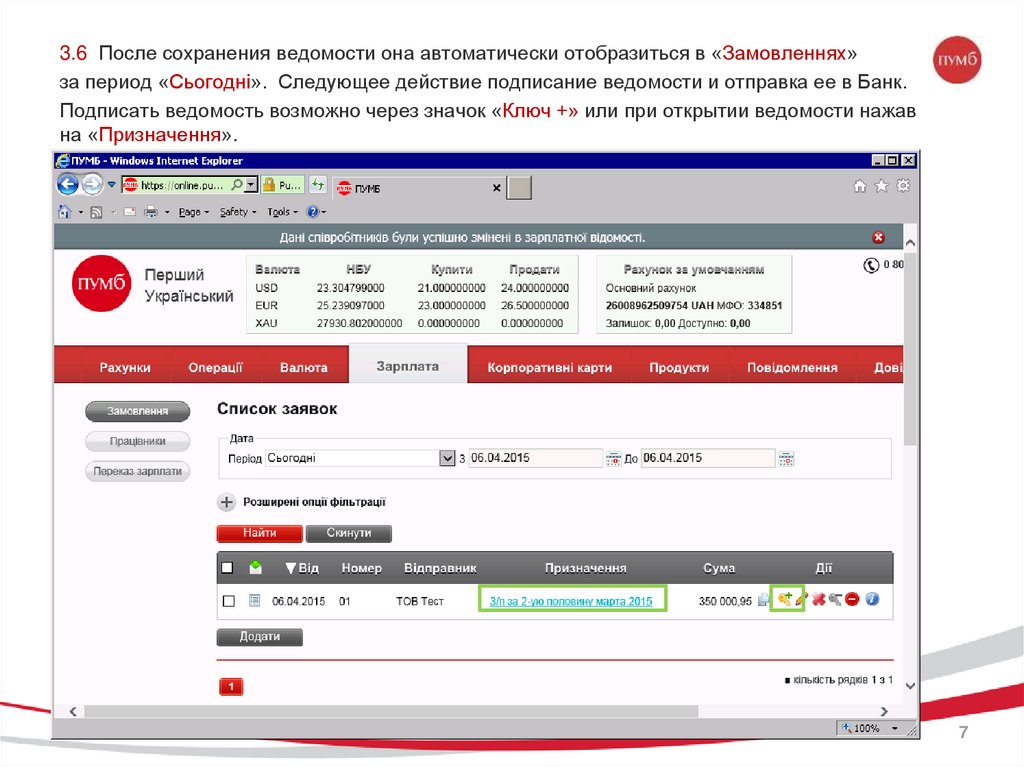 3.6 После сохранения ведомости она автоматически отобразиться в «Замовленнях»за период «Сьогодні». Следующее действие подписание ведомости и отправка ее в Банк.