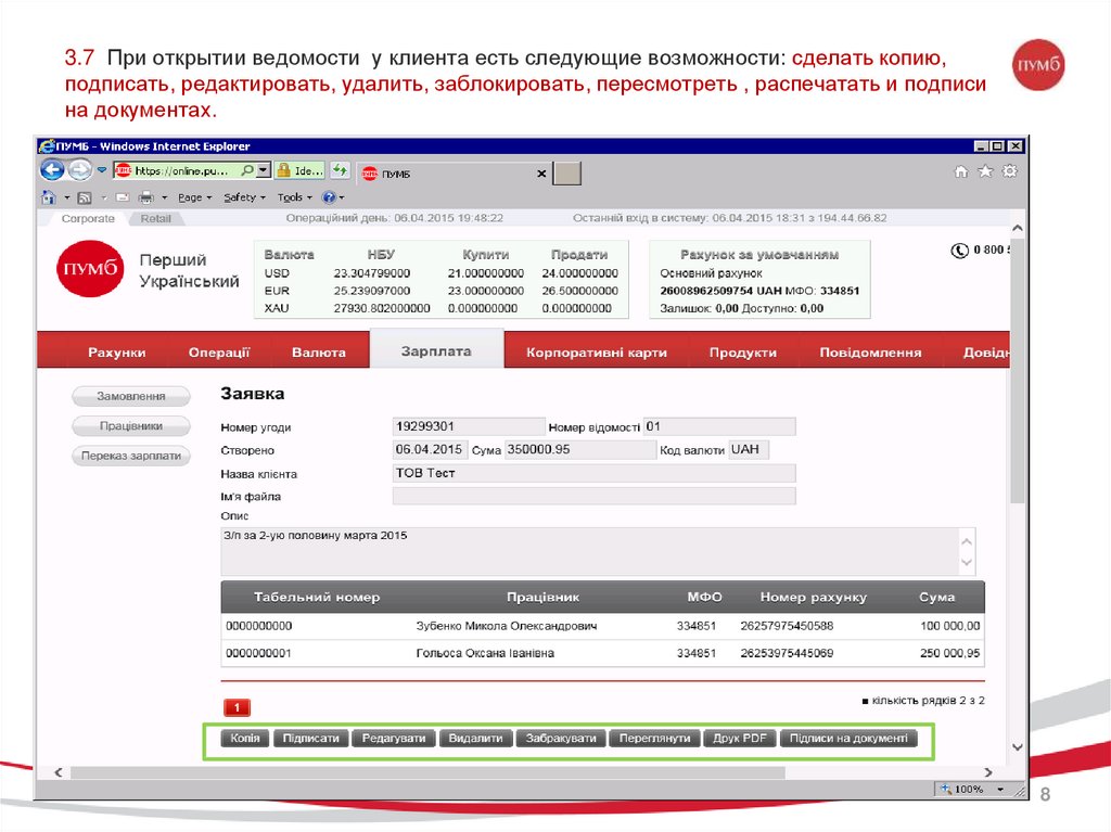3.7 При открытии ведомости у клиента есть следующие возможности: сделать копию,подписать, редактировать, удалить, заблокировать, пересмотреть , распечатать и подписи