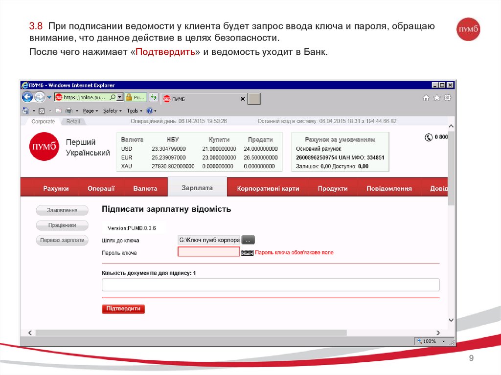 3.8 При подписании ведомости у клиента будет запрос ввода ключа и пароля, обращаювнимание, что данное действие в целях безопасности.