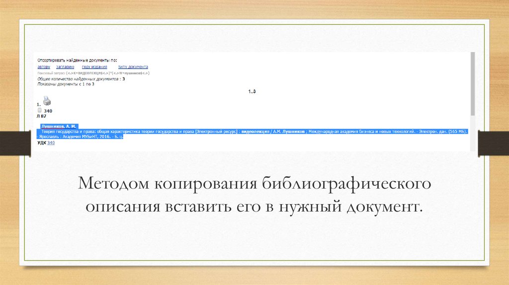 Методом копирования библиографическогоописания вставить его в нужный документ.