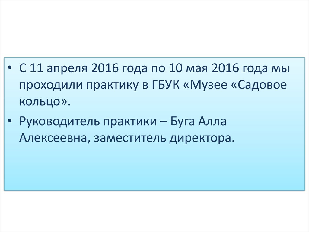 • С 11 апреля 2016 года по 10 мая 2016 года мыпроходили практику в ГБУК «Музее «Садовое