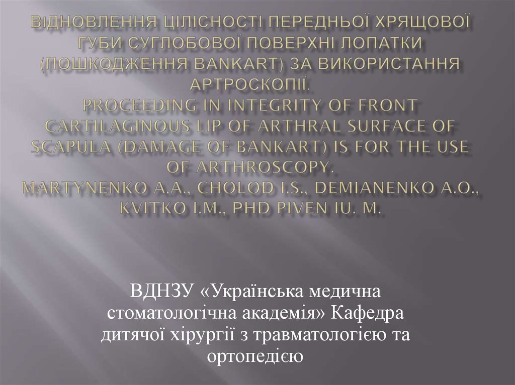 1. ВІДНОВЛЕННЯ ЦІЛІСНОСТІ ПЕРЕДНЬОЇ ХРЯЩОВОЇ ГУБИ СУГЛОБОВОЇ ПОВЕРХНІ ЛОПАТКИ (ПОШКОДЖЕННЯ BANKART) ЗА ВИКОРИСТАННЯ АРТРОСКОПІЇ.