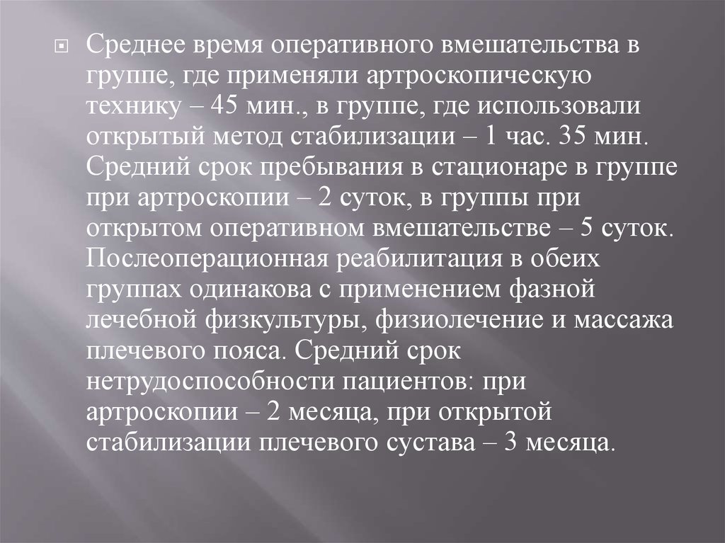 Среднее время оперативного вмешательства вгруппе, где применяли артроскопическую