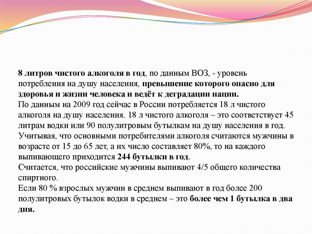 8 литров чистого алкоголя в год, по данным ВОЗ, - уровеньпотребления на душу населения, превышение которого опасно для
