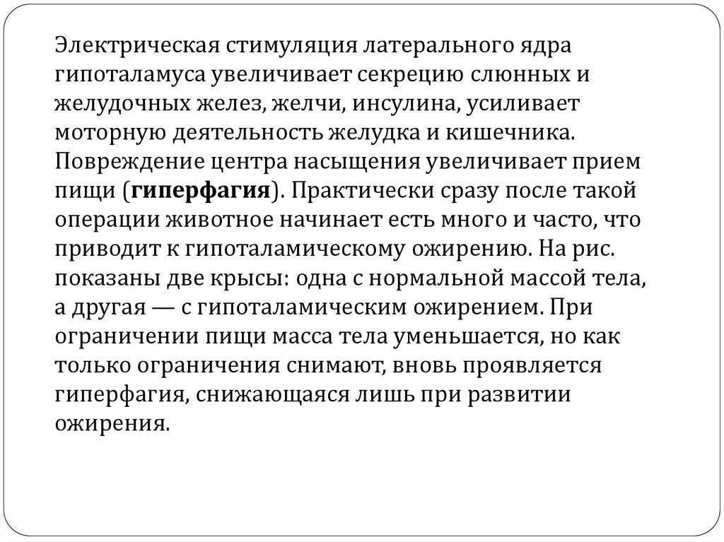 ядро гипоталамуса). Электрическая стимуляция центра голода провоцирует