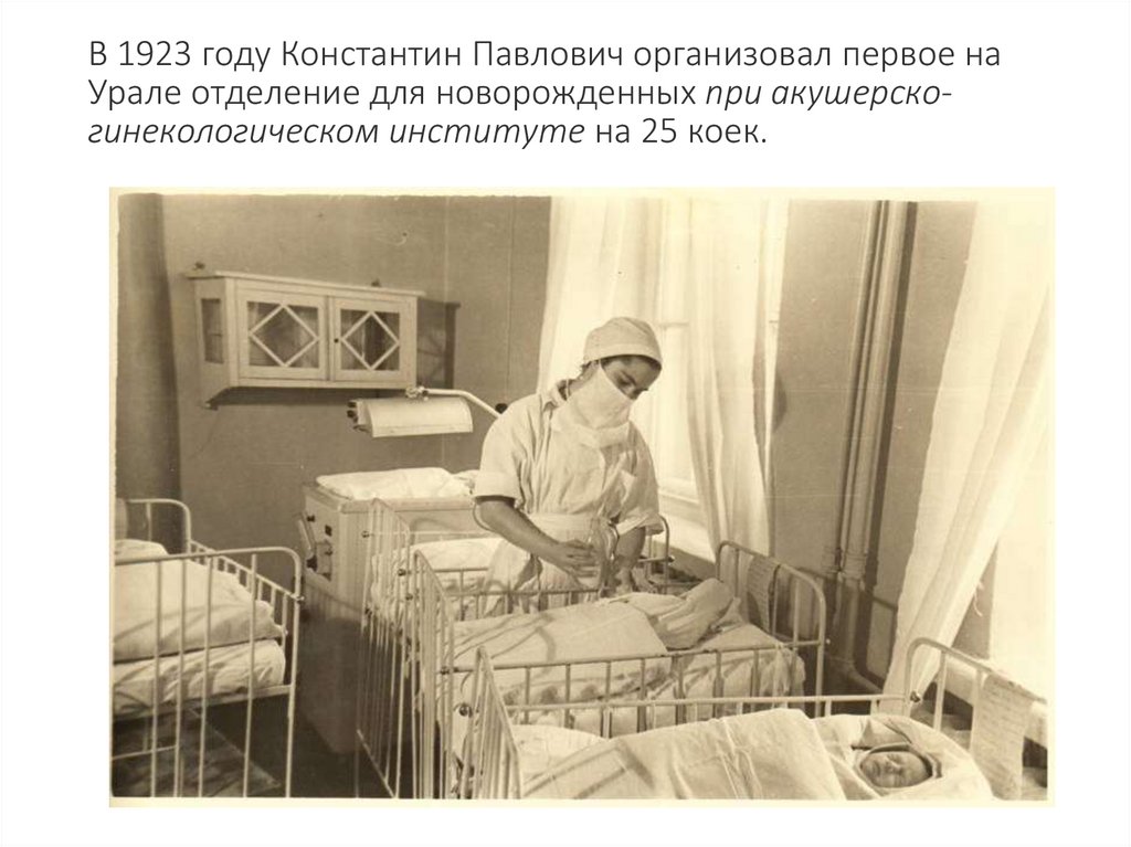 В 1923 году Константин Павлович организовал первое наУрале отделение для новорожденных при акушерскогинекологическом институте на 25 коек.