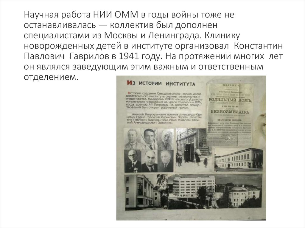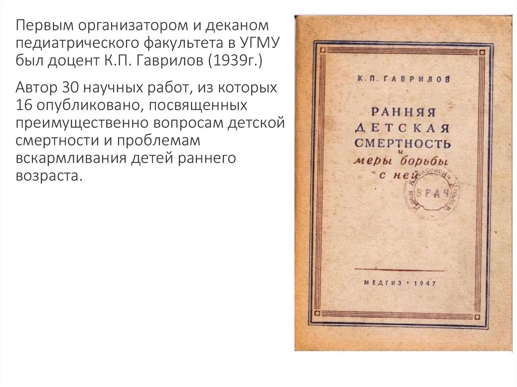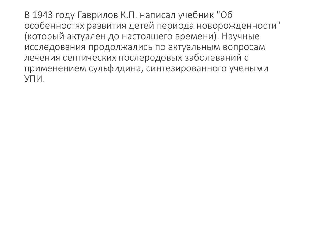 В 1943 году Гаврилов К.П. написал учебник "Обособенностях развития детей периода новорожденности"