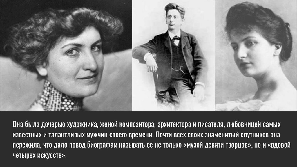Она была дочерью художника, женой композитора, архитектора и писателя, любовницей самыхизвестных и талантливых мужчин своего времени. Почти всех своих знаменитый спутников она