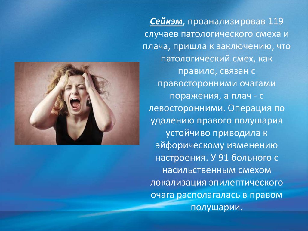 Сейкэм, проанализировав 119случаев патологического смеха и
