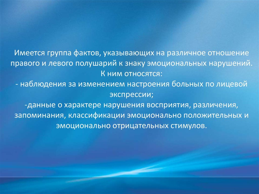 Имеется группа фактов, указывающих на различное отношениеправого и левого полушарий к знаку эмоциональных нарушений.