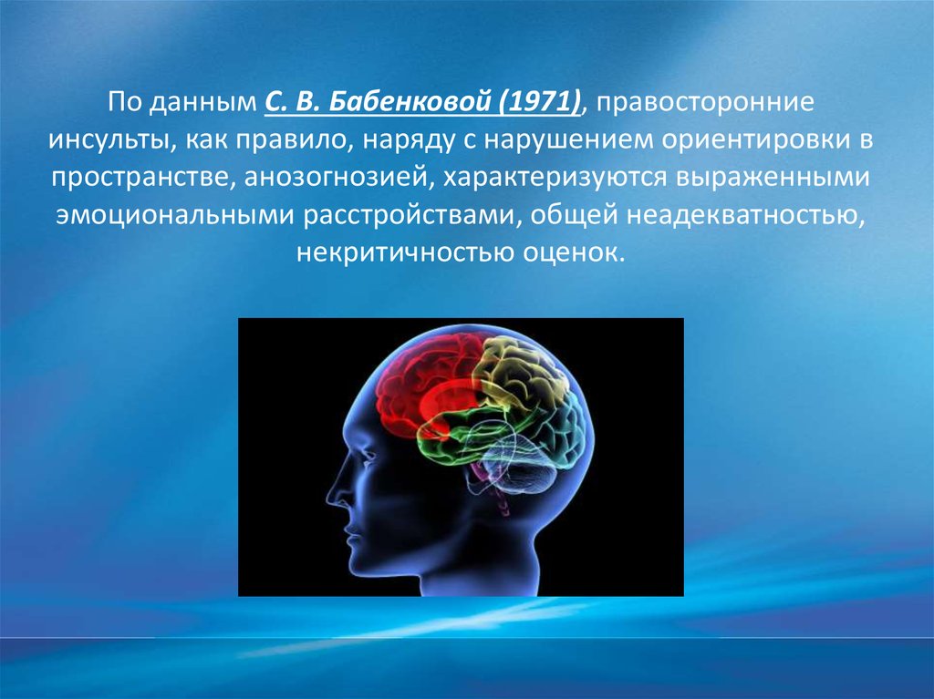 По данным С. В. Бабенковой (1971), правосторонниеинсульты, как правило, наряду с нарушением ориентировки в