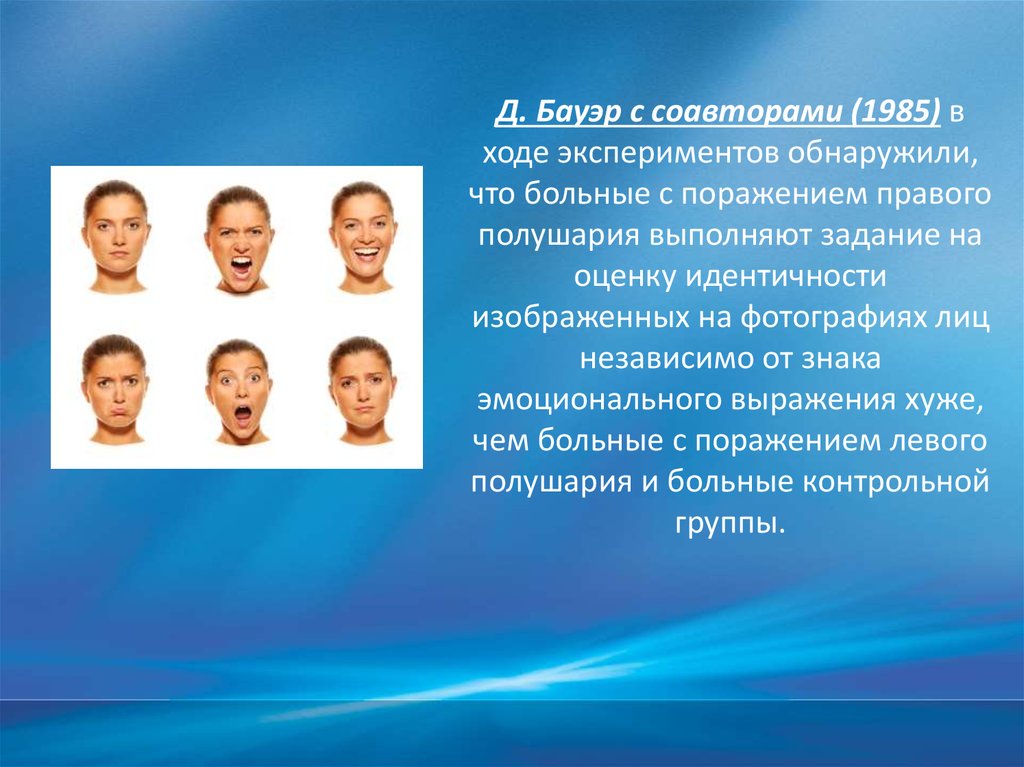 Borod et al.(1986) Больные с сосудистыми поражениямиправого полушария менее точно распознают мимические