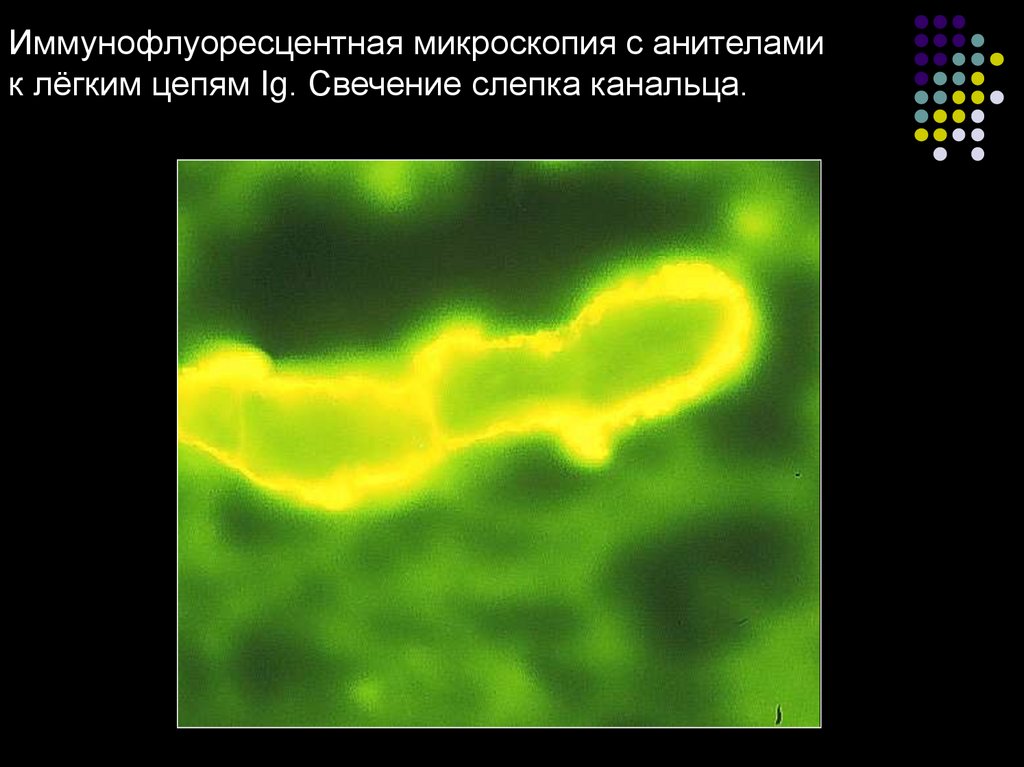 Иммунофлуоресцентная микроскопия с анителамик лёгким цепям Ig. Свечение слепка канальца.