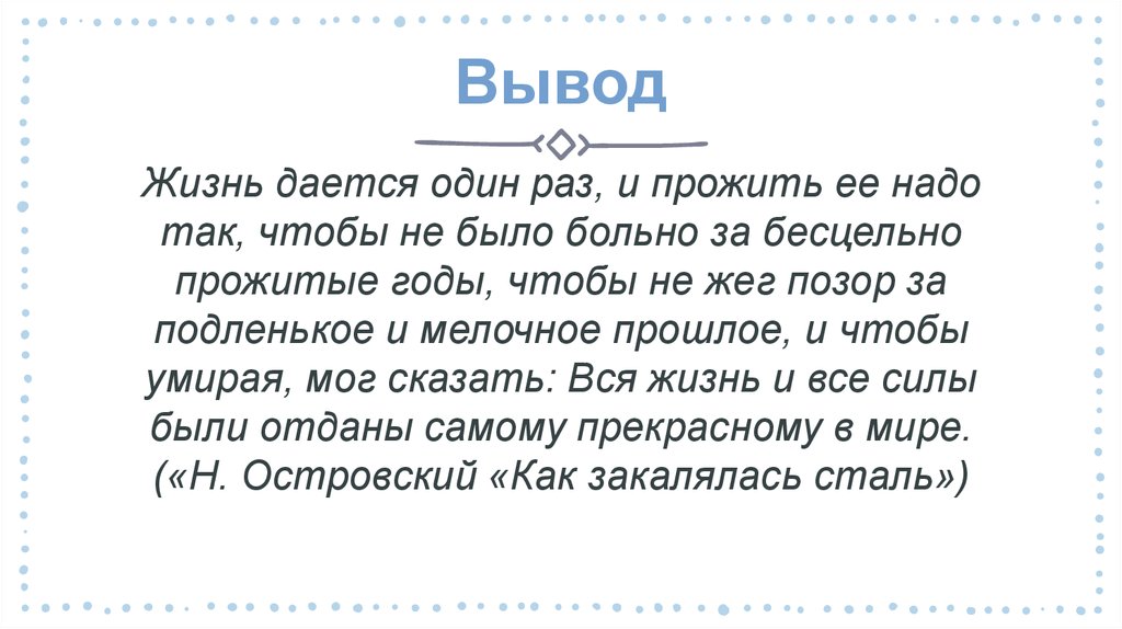 ВыводЖизнь дается один раз, и прожить ее надо