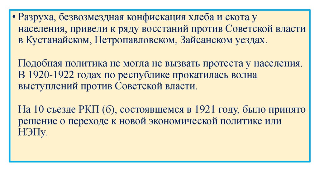 • Разруха, безвозмездная конфискация хлеба и скота унаселения, привели к ряду восстаний против Советской власти