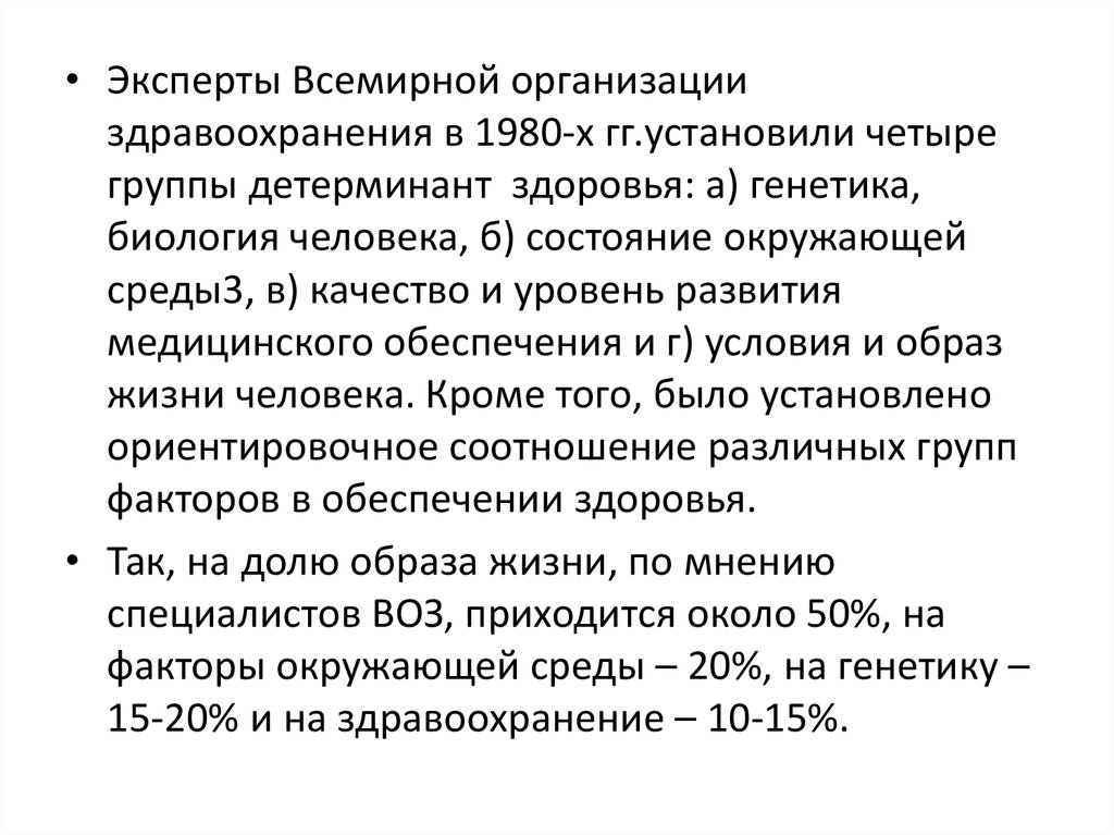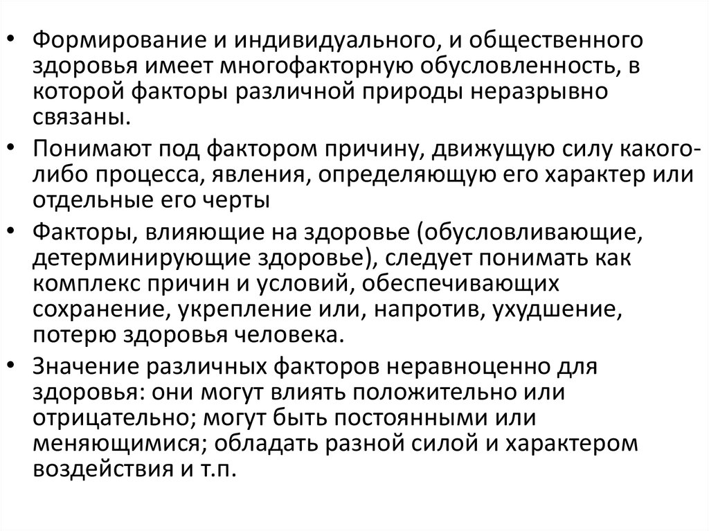 • Формирование и индивидуального, и общественногоздоровья имеет многофакторную обусловленность, в