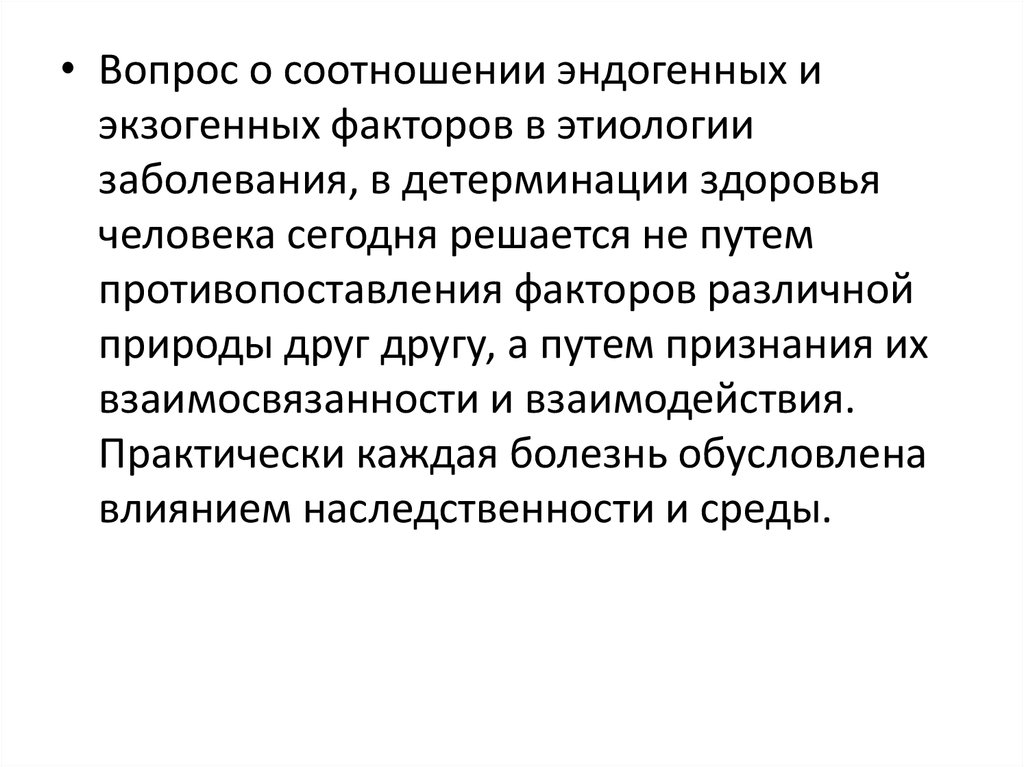 • Вопрос о соотношении эндогенных иэкзогенных факторов в этиологии