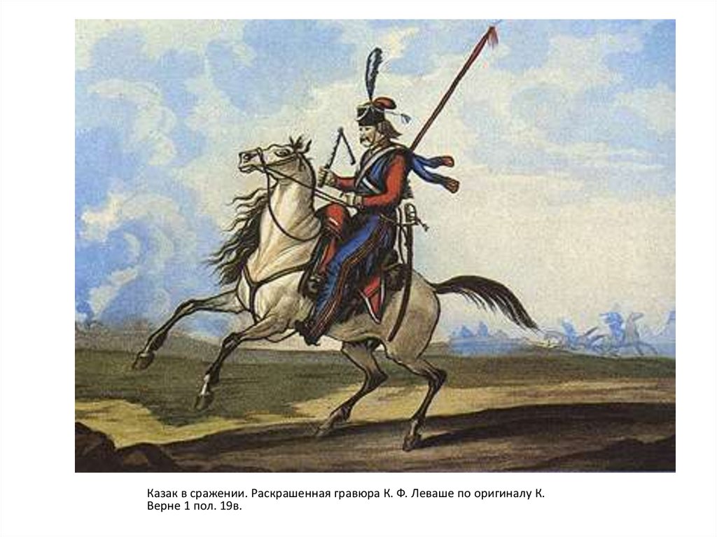 Казак в сражении. Раскрашенная гравюра К. Ф. Леваше по оригиналу К.Верне 1 пол. 19в.