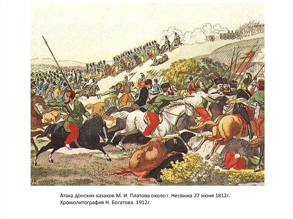 Атака донских казаков М. И. Платова около г. Несвижа 27 июня 1812г.Хромолитография Н. Богатова. 1912г.
