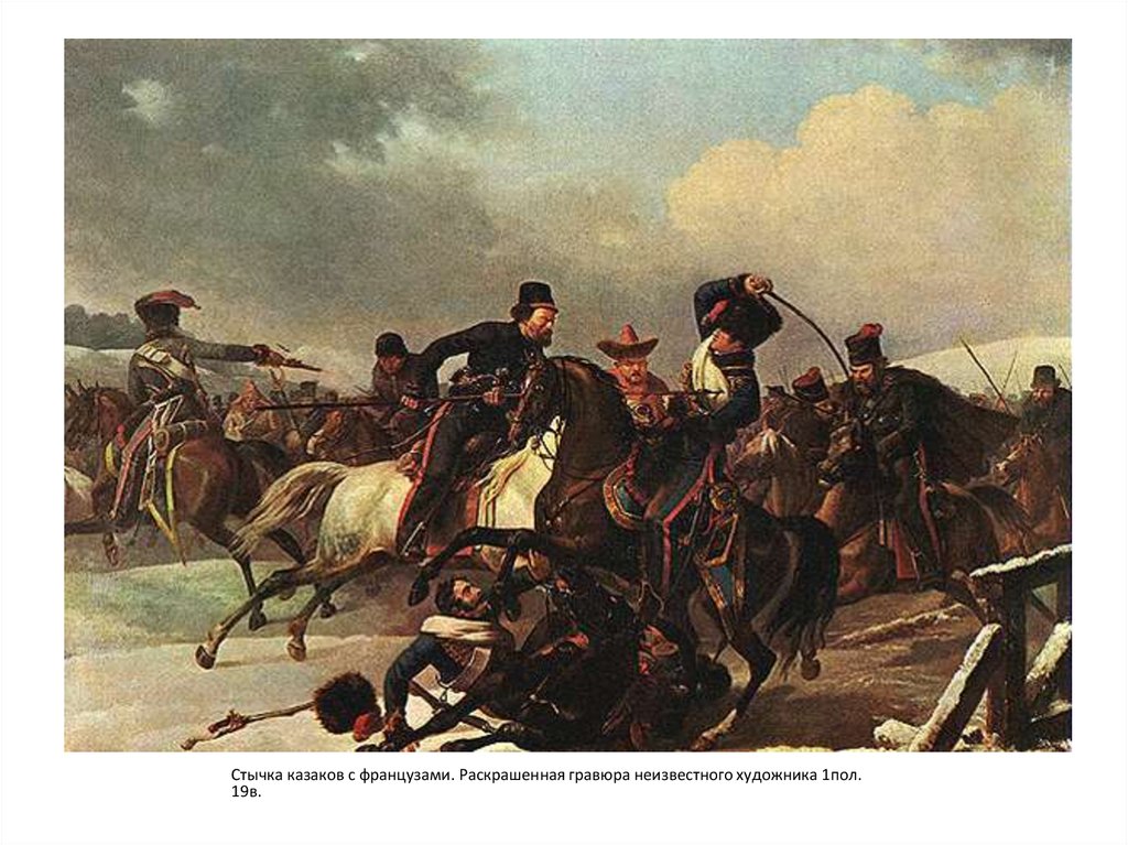 Стычка казаков с французами. Раскрашенная гравюра неизвестного художника 1пол.19в.