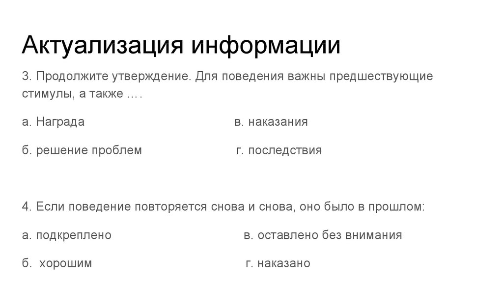 Актуализация информации3. Продолжите утверждение. Для поведения важны предшествующие