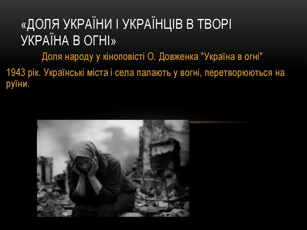 • Саме в цей час О. Довженко створює кіноповість "Україна в огні" —один з кращих творів воєнного часу. Та ця кіноепопея не сподобалась