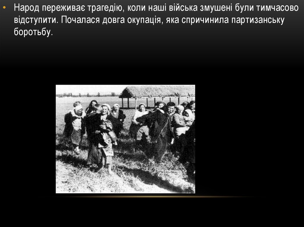 • Народ переживає трагедію, коли наші війська змушені були тимчасововідступити. Почалася довга окупація, яка спричинила партизанську