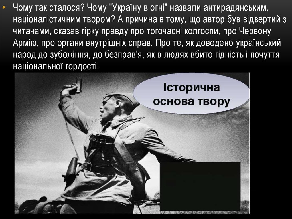 • Чому так сталося? Чому "Україну в огні" назвали антирадянським,націоналістичним твором? А причина в тому, що автор був відвертий з