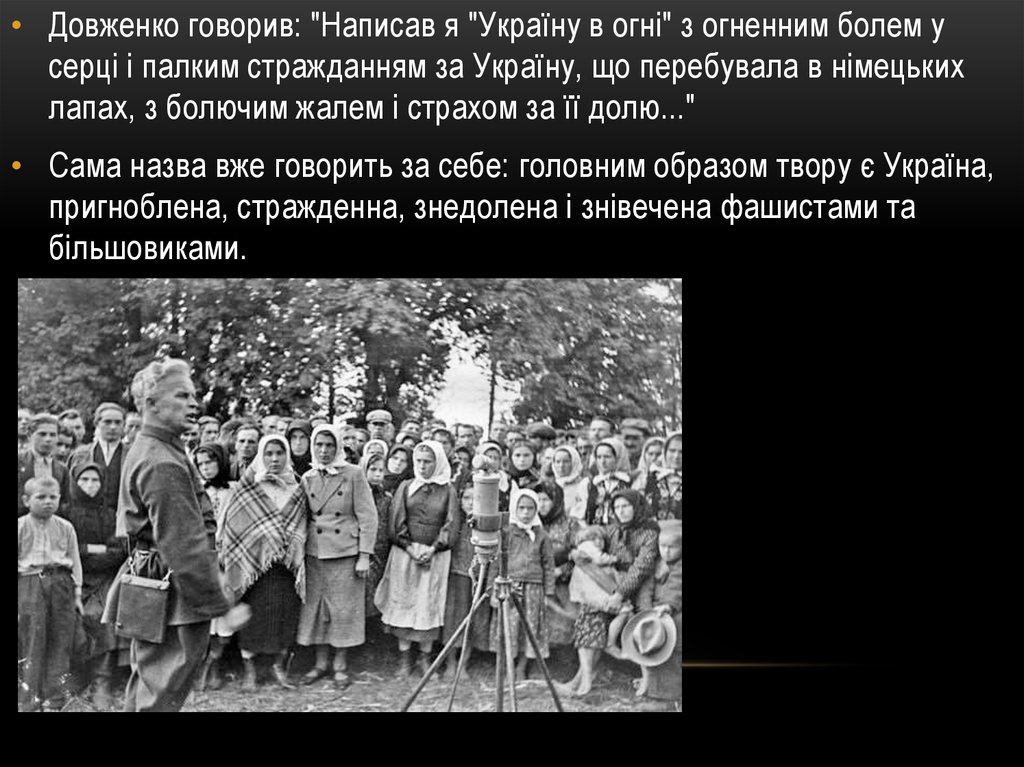 • Довженко говорив: "Написав я "Україну в огні" з огненним болем усерці і палким стражданням за Україну, що перебувала в німецьких