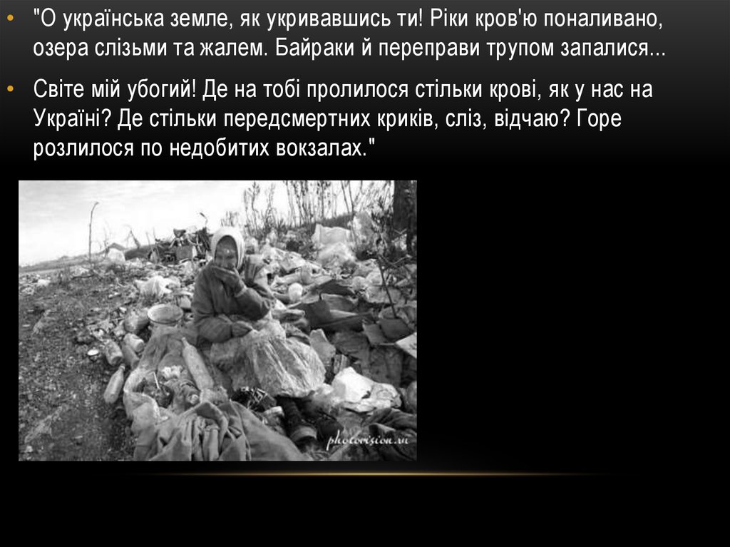 • "О українська земле, як укривавшись ти! Ріки кров'ю поналивано,озера слізьми та жалем. Байраки й переправи трупом запалися...
