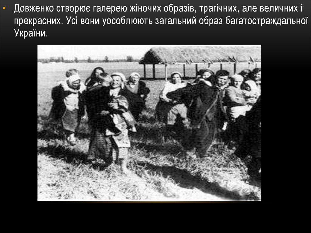• Довженко створює галерею жіночих образів, трагічних, але величних іпрекрасних. Усі вони уособлюють загальний образ багатостраждальної