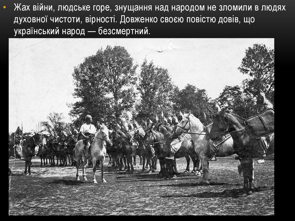 • Жах війни, людське горе, знущання над народом не зломили в людяхдуховної чистоти, вірності. Довженко своєю повістю довів, що