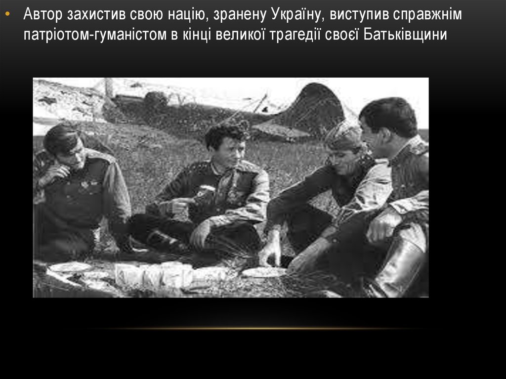 • Автор захистив свою націю, зранену Україну, виступив справжнімпатріотом-гуманістом в кінці великої трагедії своєї Батьківщини