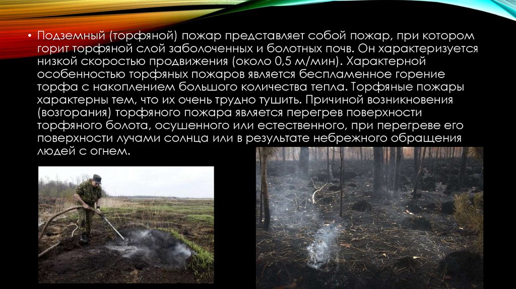 • Подземный (торфяной) пожар представляет собой пожар, при которомгорит торфяной слой заболоченных и болотных почв. Он характеризуется