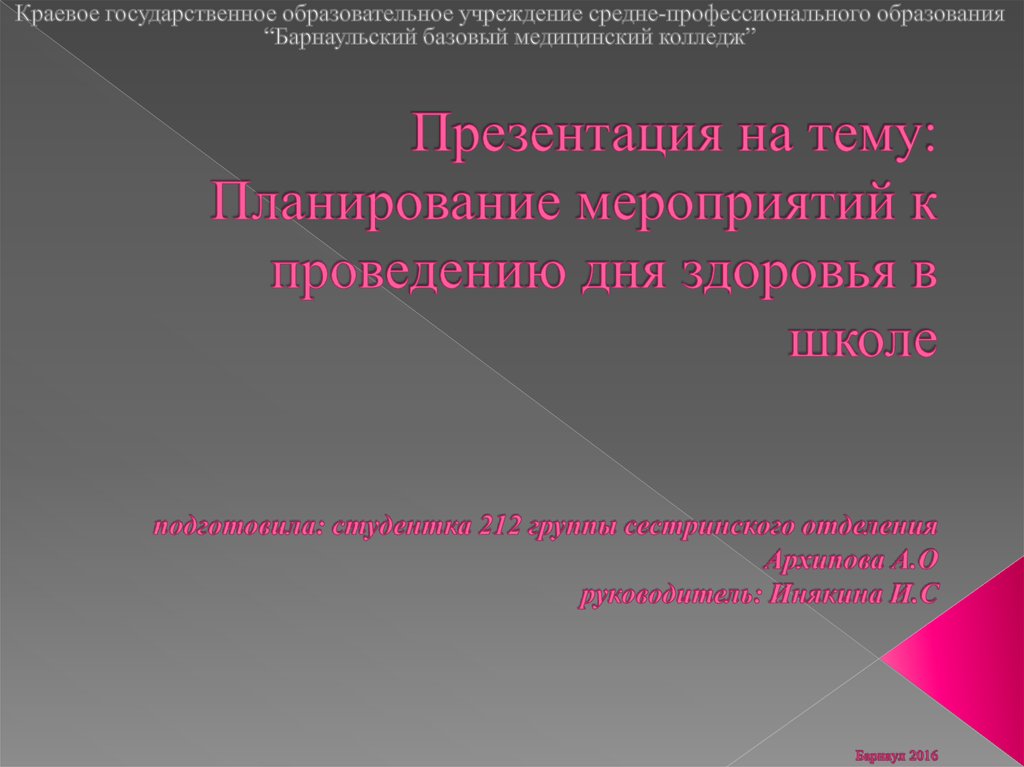 1. Презентация на тему: Планирование мероприятий к проведению дня здоровья в школе подготовила: студентка 212 группы сестринского
