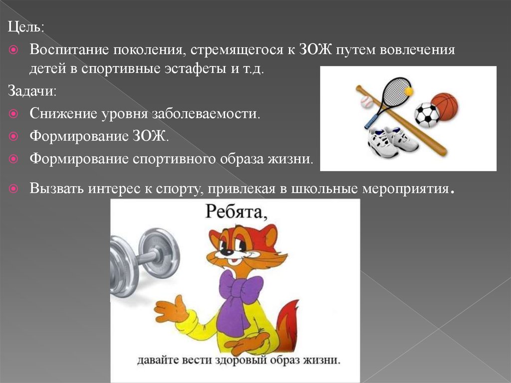 Цель:Воспитание поколения, стремящегося к ЗОЖ путем вовлечения