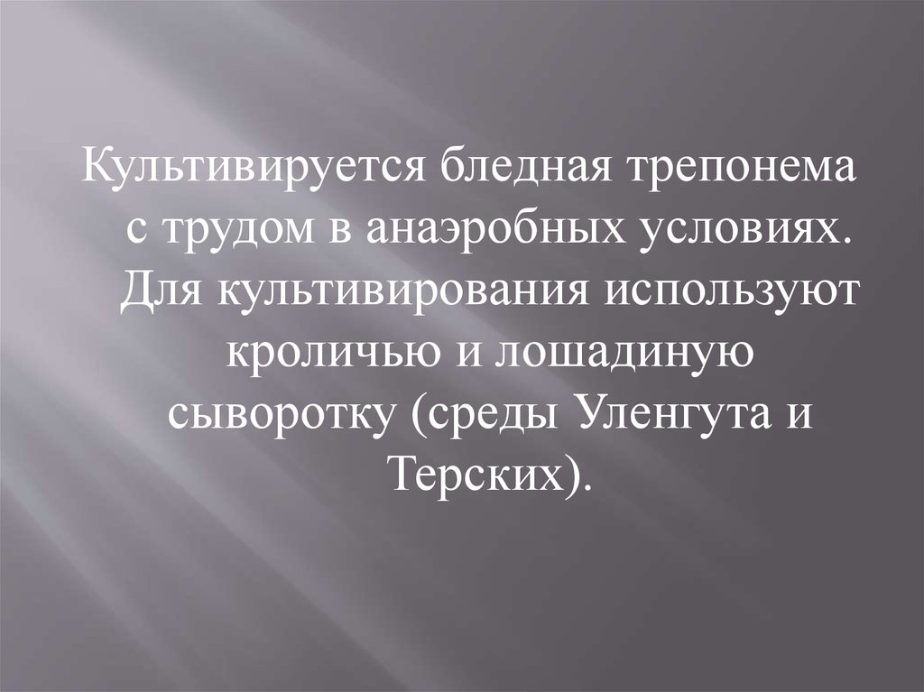 Культивируется бледная трепонемас трудом в анаэробных условиях.