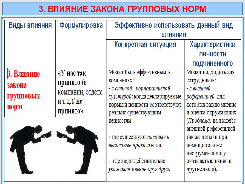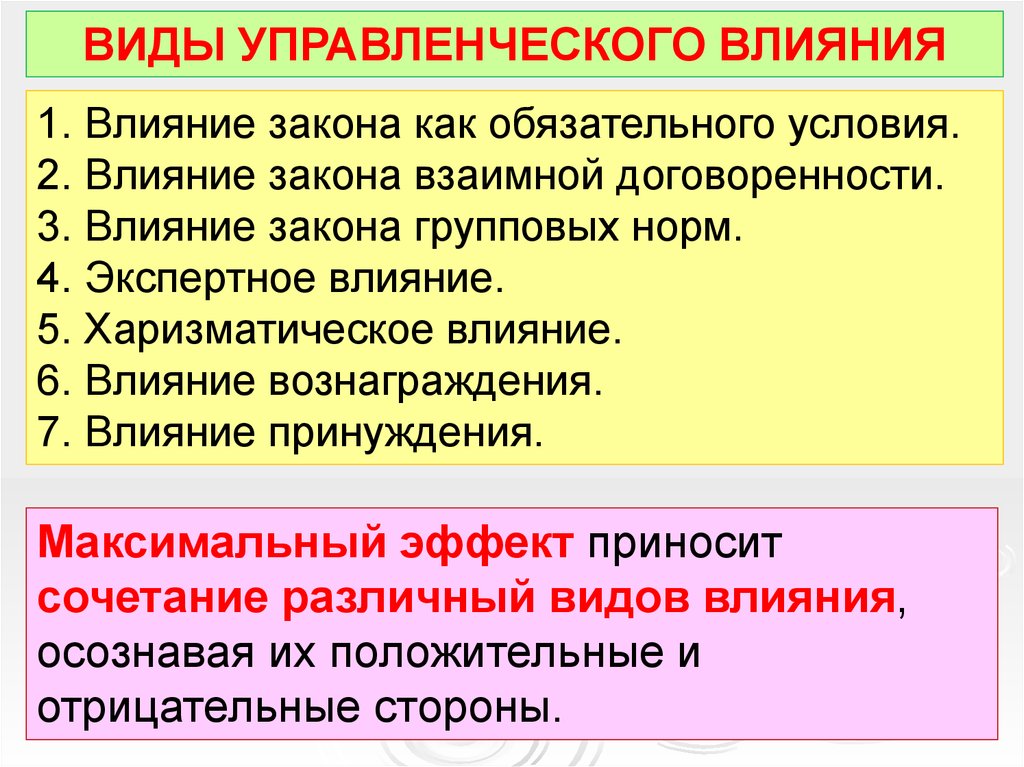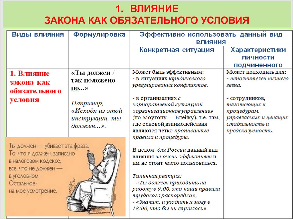 ВИДЫ УПРАВЛЕНЧЕСКОГО ВЛИЯНИЯ1. Влияние закона как обязательного условия.