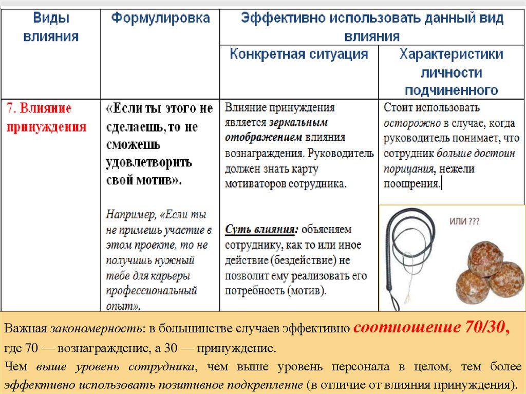 Важная закономерность: в большинстве случаев эффективно соотношение 70/30,где 70 — вознаграждение, а 30 — принуждение.