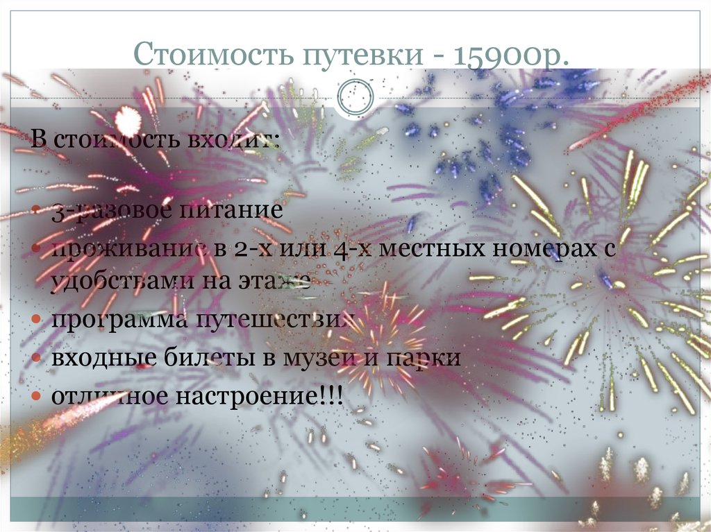 Дополнительно оплачивается ж/д билеты (ценауказана в оба направления с сопровождением и