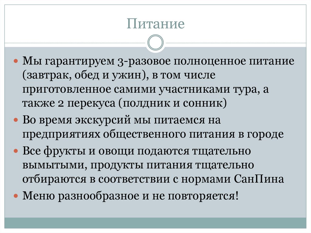 Мы гарантируем 3-разовое полноценное питание(завтрак, обед и ужин), в том числе