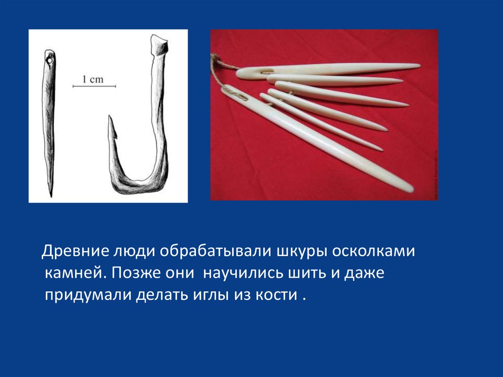 Древние люди обрабатывали шкуры осколкамикамней. Позже они научились шить и даже