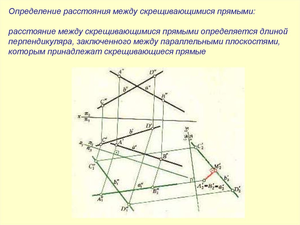 Определение расстояния между скрещивающимися прямыми:расстояние между скрещивающимися прямыми определяется длиной