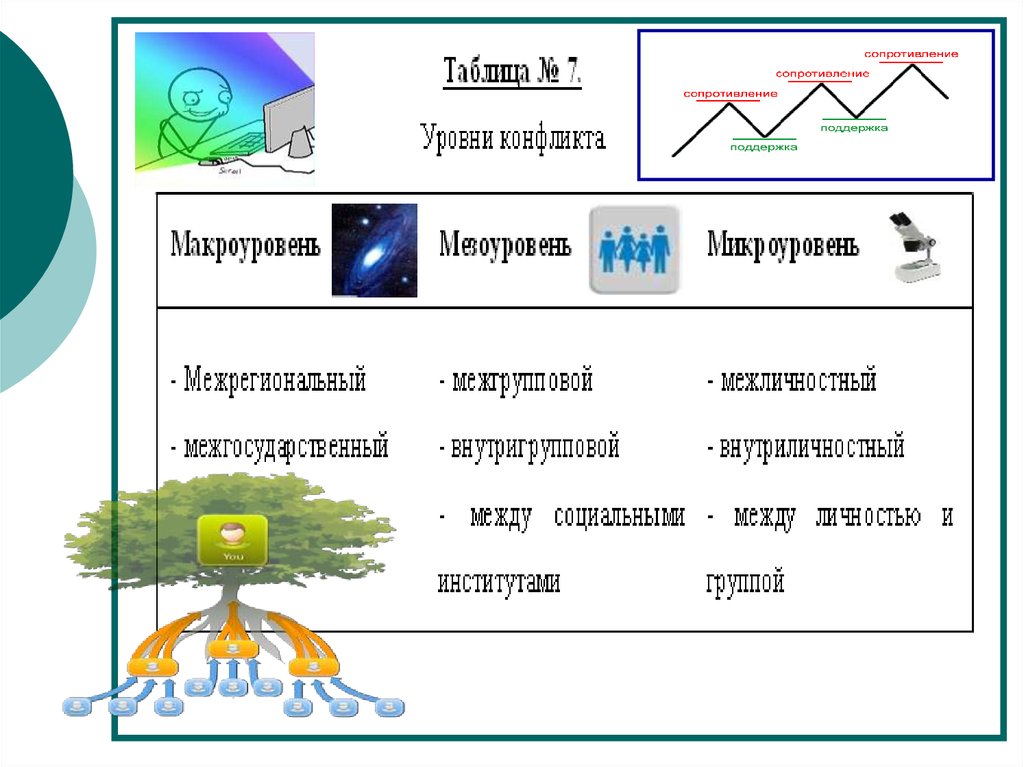 1. Межиндивидуальные конфликты;2. Межгрупповые конфликты: