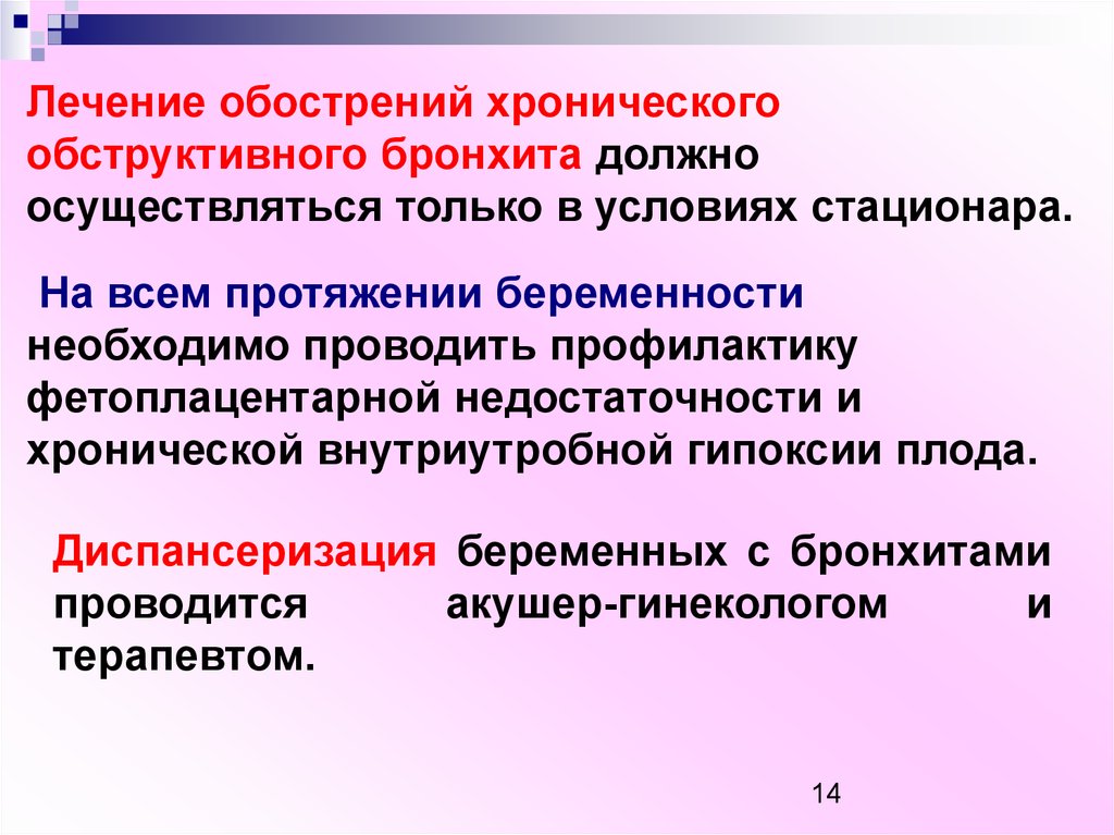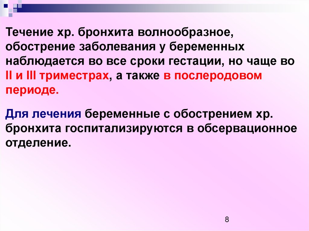 Течение хр. бронхита волнообразное,обострение заболевания у беременных
